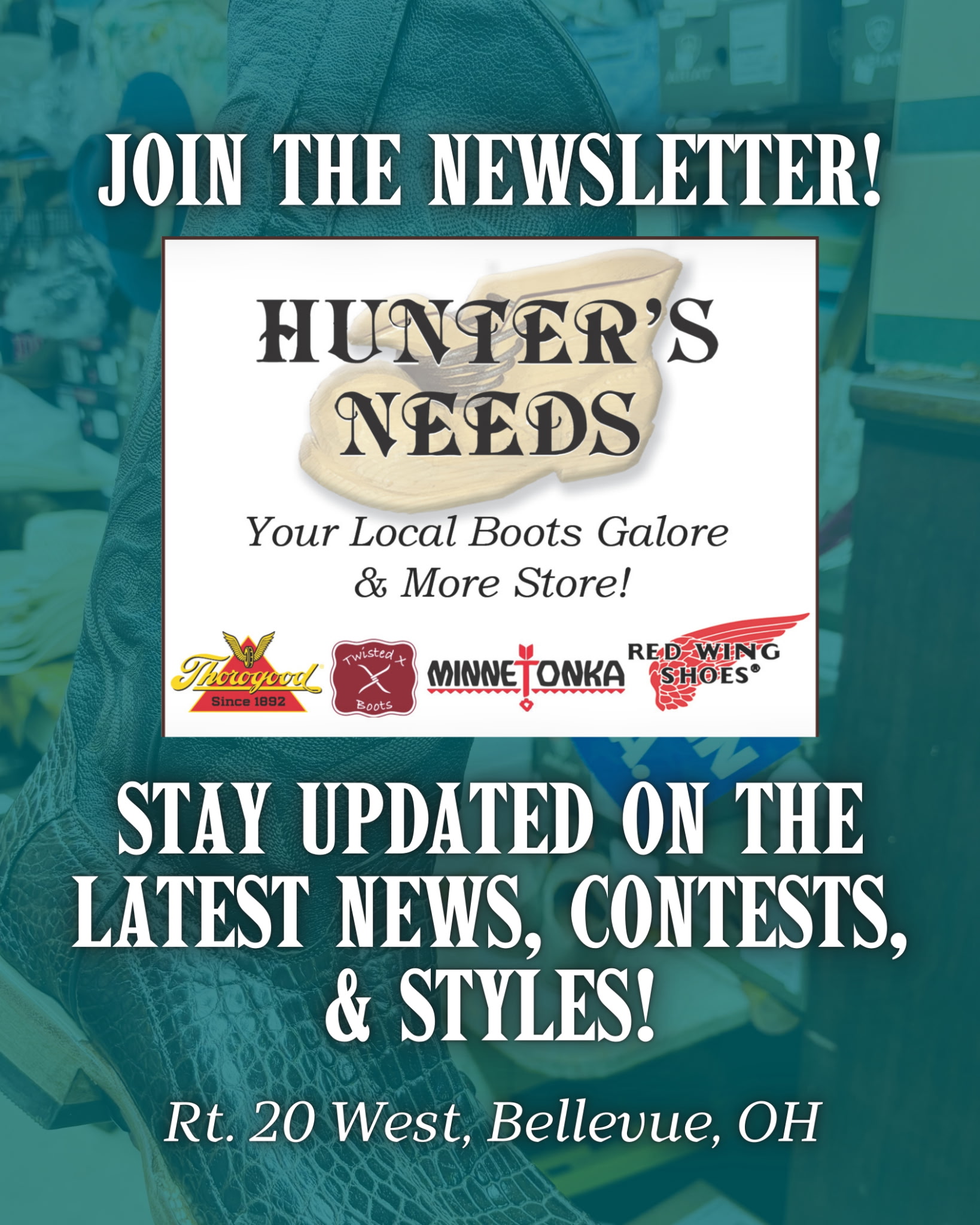 Hunter's Needs and Mercantile welcomes you! We are a seasoned outfitter providing hunting and fishing licenses, a large assortment of footwear for both indoor and outdoor for all ages, clothing and accessories and so much more, catering to the Northwest Ohio area as we are situated along State Route 20, just west of Bellevue, Ohio. Our history started over 35 Years ago when we focused on coon hunters and now with a lesser demand for the sport, due to demand we chose to expand our business to incorporate an impressive line of various name brand and styles of footwear for men, women and children.